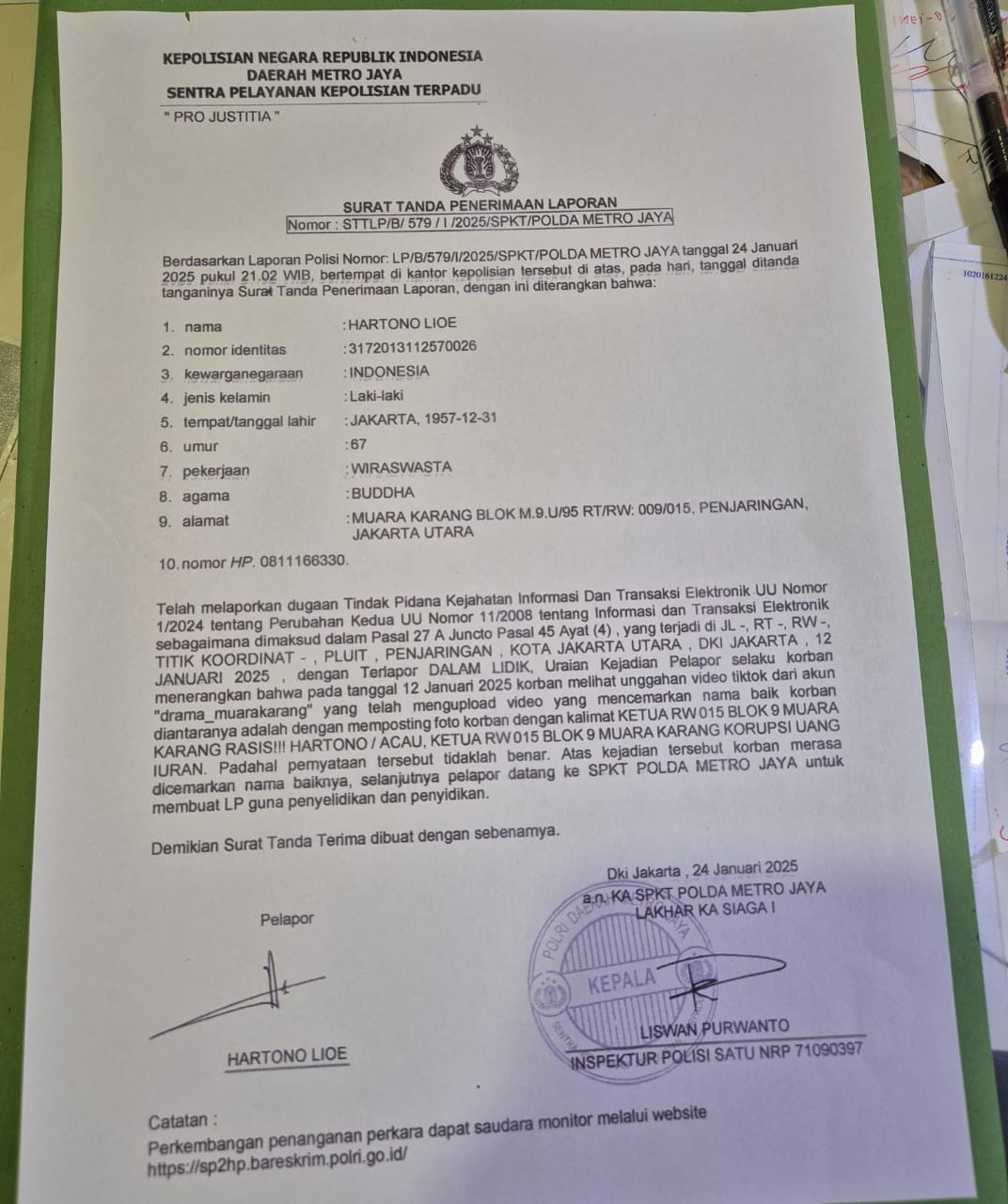 Laporan Hartono Lioe Ke Polsek Penjaringan Diduga Upaya Kriminalisasi
